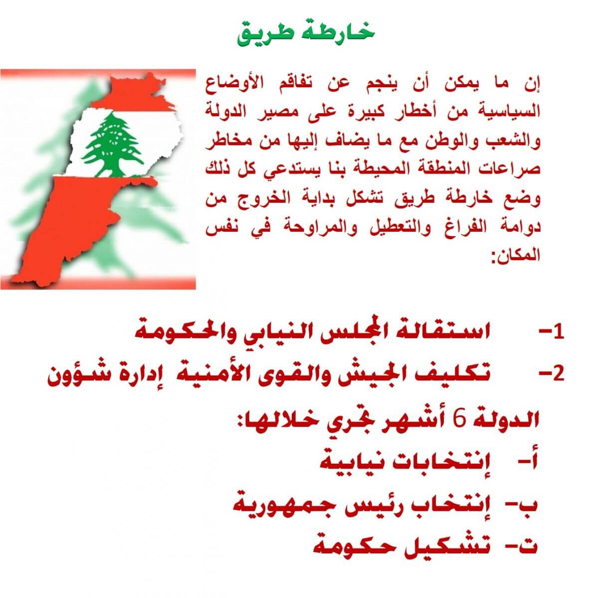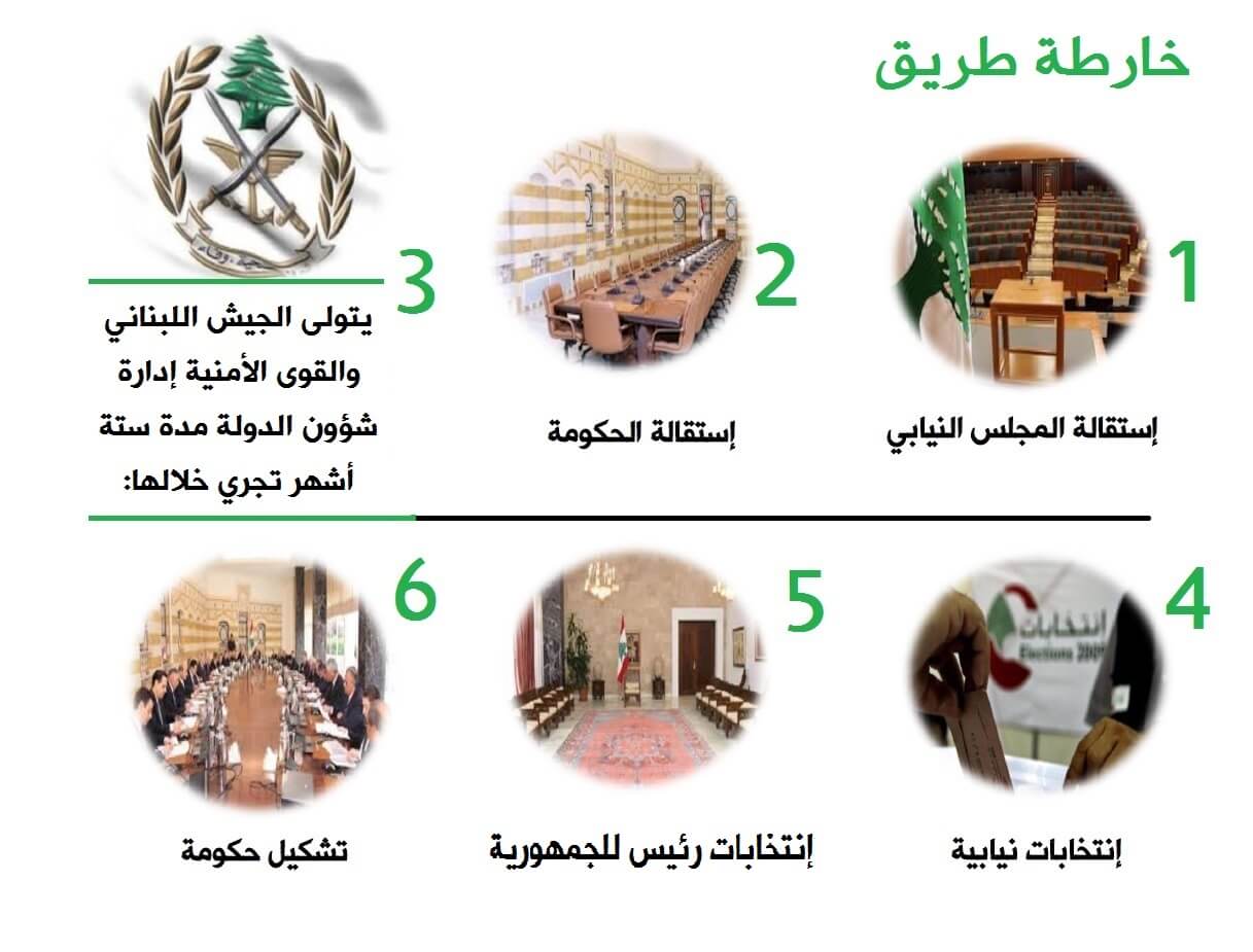 وتبتدئ هذه الخارطة بتقديم استقالة الحكومة ومجلس النواب للشعب والرجوع إليه لأنه مصدر كل السلطات، ولأنه لا وجود للفراغ في السلطة يتكلّف الجيش والقوى الأمنيّة بإدارة شؤون الدولة، ونقترح أن تكون مدّة التكليف ستة أشهر يتم خلالها الإعداد لانتخابات نيابية يتبعها انتخاب رئيس للجمهورية وتشكيل حكومة جديدة، وهي فترة قصيرة المدى تشكل فرصة للذين خسروا ثقة الشعب من استعادتها، وبالعودة إلى الشعب تسترجع المؤسسات شرعيتها المفقودة والدولة مكانتها في الداخل والخارج.