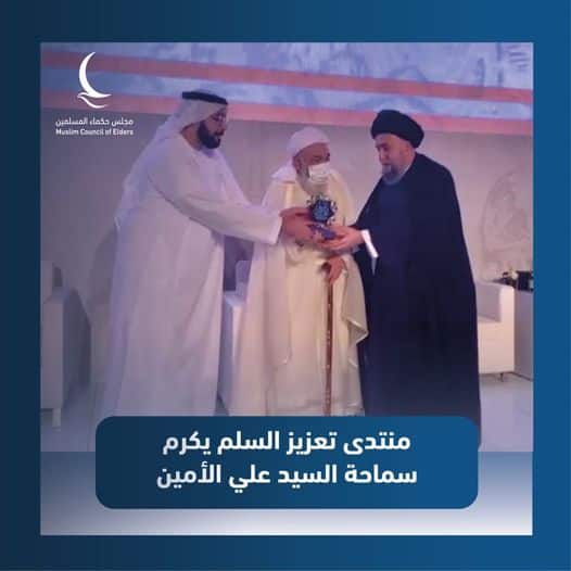 خلال فعاليات اليوم الثاني من الملتقى الثامن لمنتدى تعزيز السلم فضيلة العلامة معالي الشيخ عبدالله بن بيه رئيس مجلس الإمارات للإفتاء الشرعي رئيس منتدى تعزيز السلم، عضو مجلس حكماء المسلمين يُكَرِّمُ سماحةَ الشيخ السيد علي الأمين عضو مجلس حكماء المسلمين، باعتباره رمزا من رموز الاعتدال والتسامح والمواطنة، وذلك بحضور ثلة من العلماء ورجال الدين والأكاديميين.