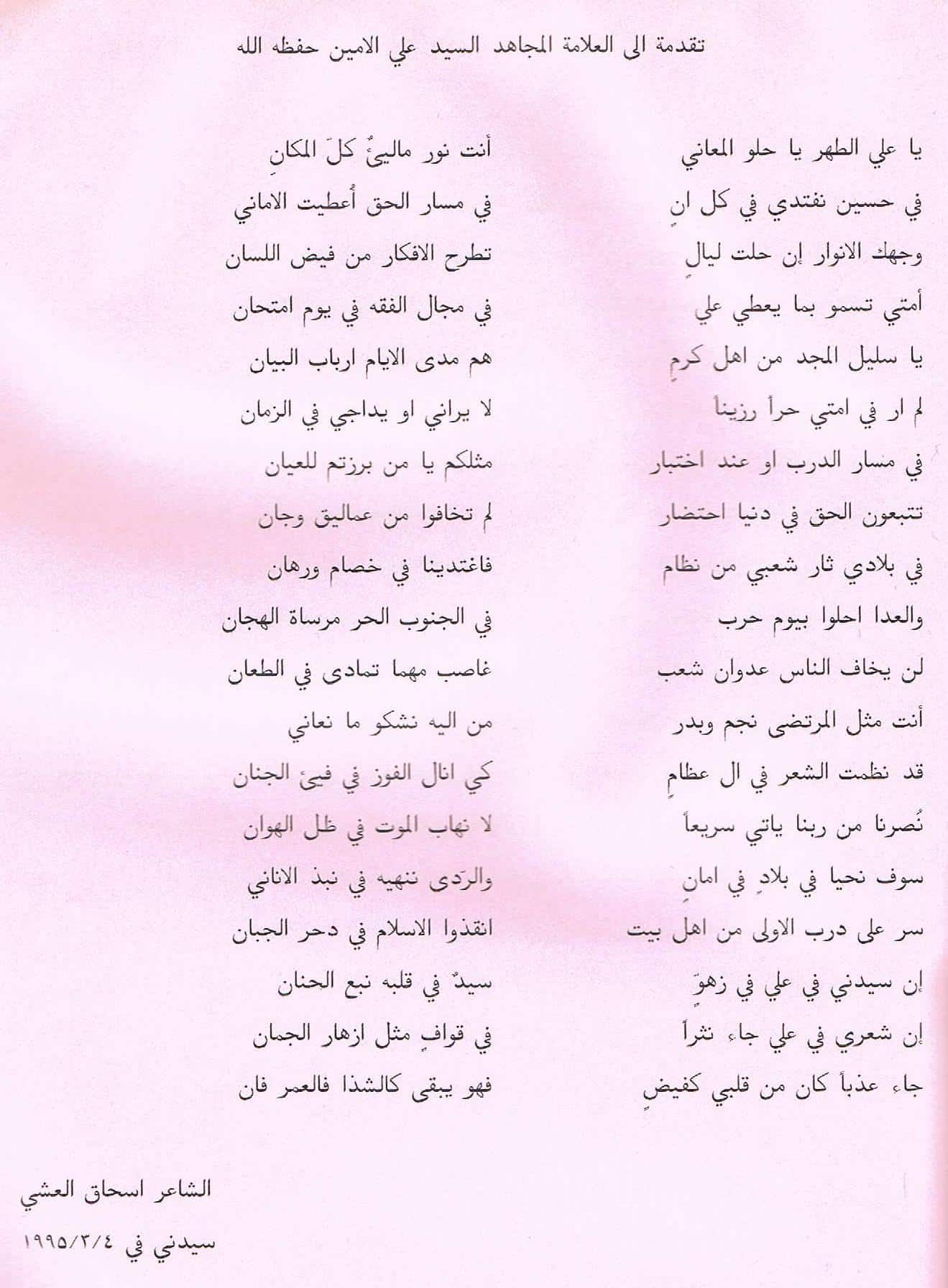 يا علي الطهر يا حلو المعاني – الشاعر اسحق العشي – سيدني 4 مارس، 1995 81 زيارة شاركها Facebook Twitter Pinterest يا علي الطهر يا حلو المعاني أنت نور مالئ كل المكان مرتبط شارك وانشر